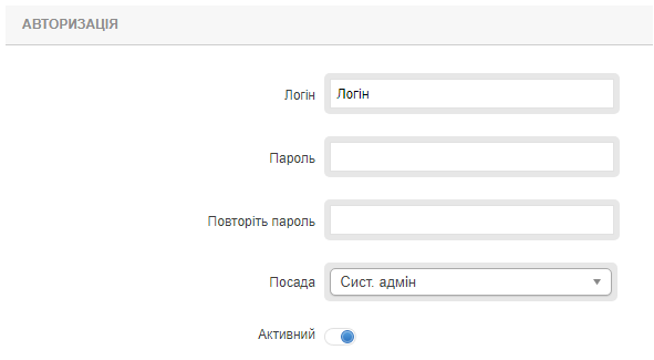 Прапор активності облікового запису «Активний» якщо прапор переведений в стан вимкнено, то обліковий
