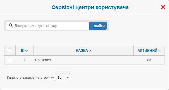 | У вікні будуть відображені всі сервісні центри (СЦ), які прив'язані до облікового запису Адміністратора. В полі «Знайти», можна вказати назву СЦ і натиснути кнопку «Знайти». Після визначення СЦ до якого необхідно прив'язати |